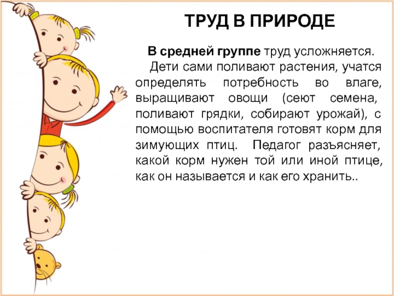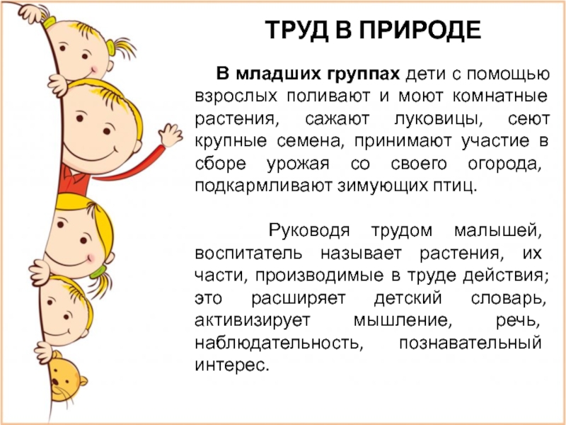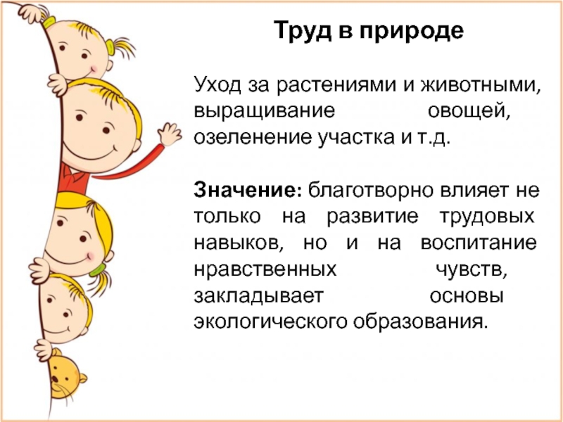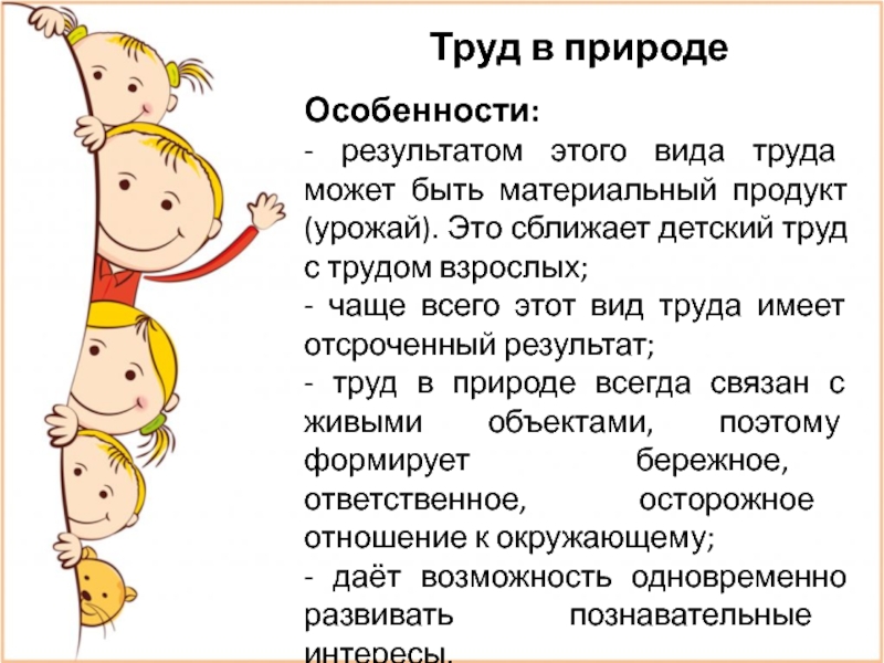 - труд в природе всегда связан с живыми объектами, поэтому формирует бережное, ответственное, осторожное отношение к окружающему;
