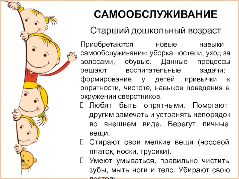 уход за волосами, обувью. Данные процессы решают воспитательные задачи: формирование