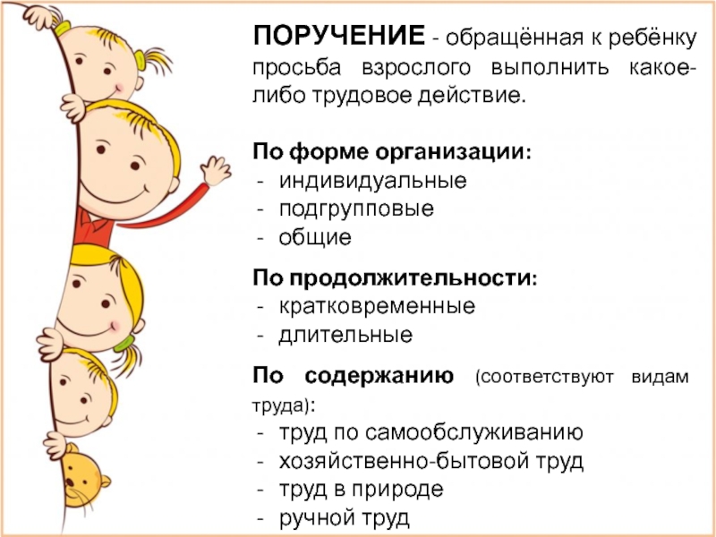 Слайд 28ПОРУЧЕНИЕ - обращённая к ребёнку просьба взрослого выполнить какое-либо трудовое