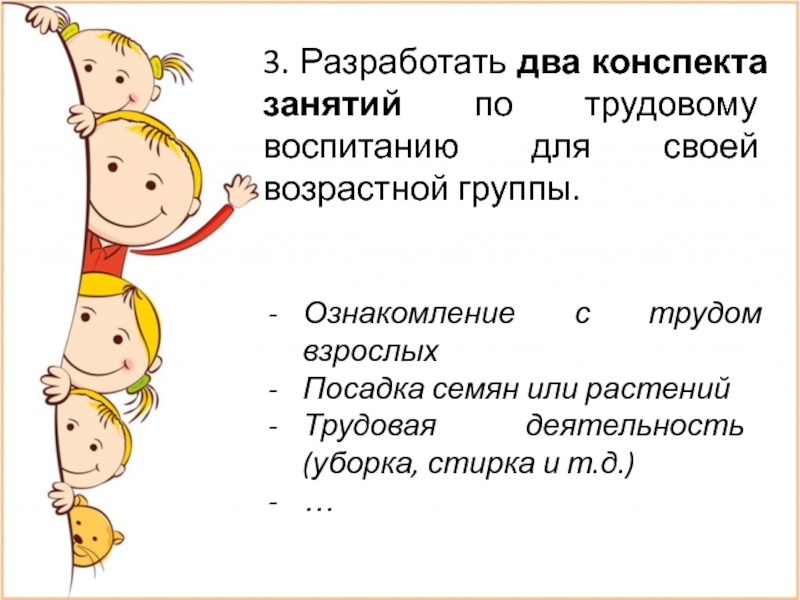 Слайд 413. Разработать два конспекта занятий по трудовому воспитанию для своей