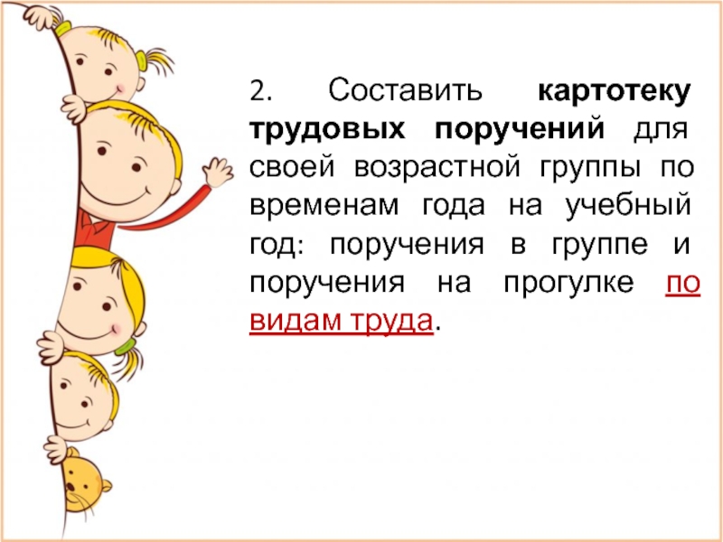 Слайд 382. Составить картотеку трудовых поручений для своей возрастной группы по