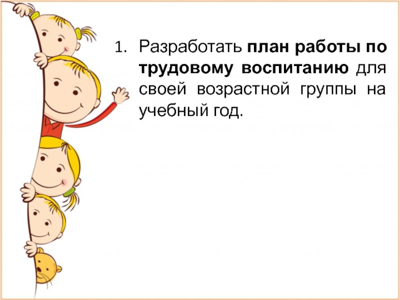 Слайд 36Разработать план работы по трудовому воспитанию для своей возрастной группы