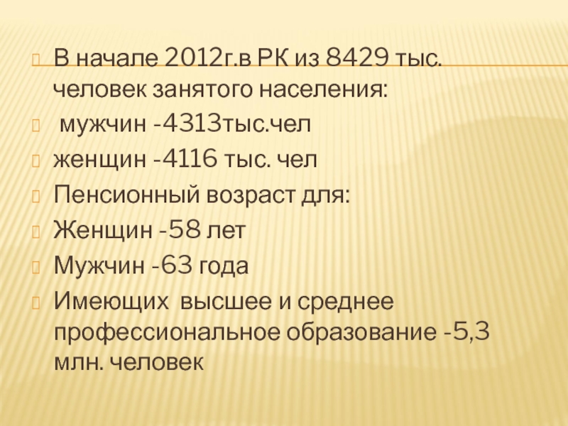 В начале 2012г.в РК из 8429 тыс. человек занятого