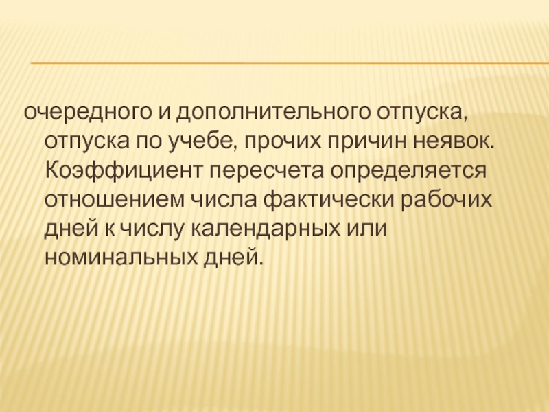 Слайд 15очередного и дополнительного отпуска, отпуска по учебе, прочих причин неявок.