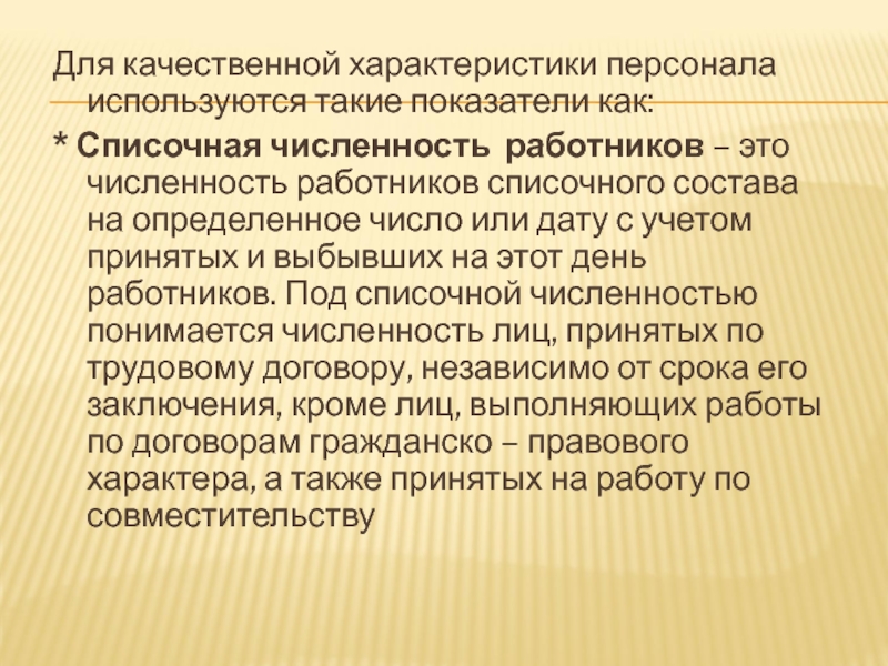 или дату с учетом принятых и выбывших на этот день работников. Под списочной численностью понимается численность лиц, принятых по трудовому договору, независимо от срока его заключения, кроме лиц, выполняющих работы по договорам гражданско – правового характера, а также принятых на работу по совместительству