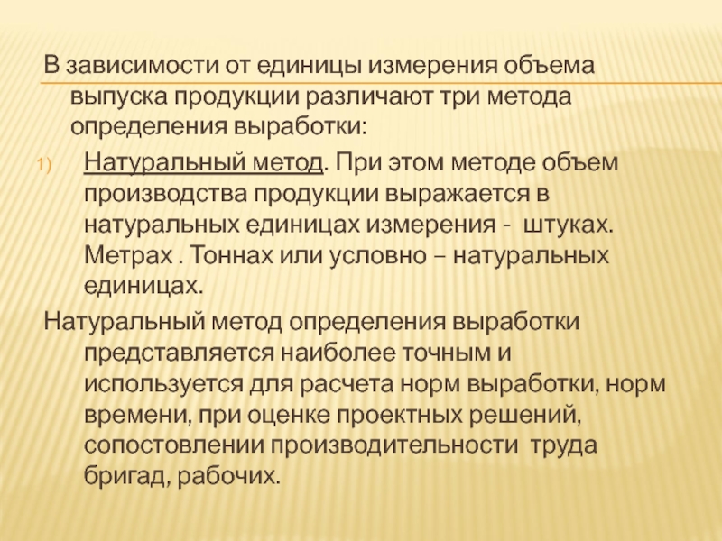 Натуральный метод определения выработки представляется наиболее точным и используется для расчета норм выработки, норм времени, при оценке проектных решений, сопостовлении производительности труда бригад, рабочих.