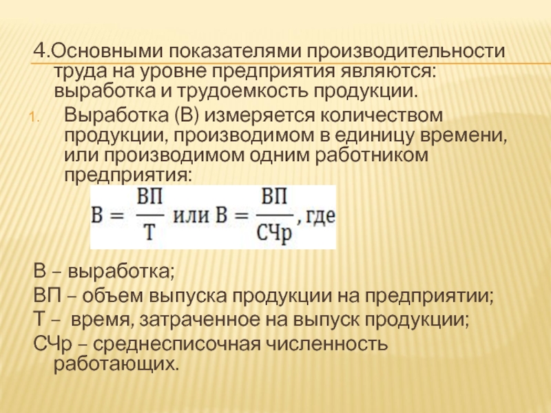 Слайд 454.Основными показателями производительности труда на уровне предприятия являются: выработка и