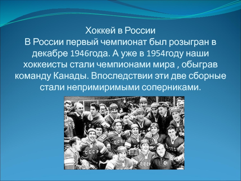 1946года. А уже в 1954году наши хоккеисты стали чемпионами мира