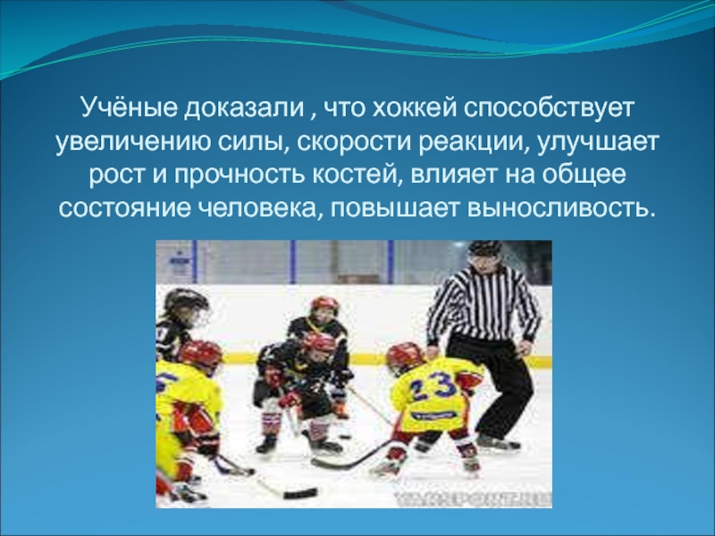 Слайд 15Учёные доказали , что хоккей способствует увеличению силы, скорости реакции,