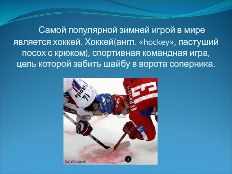 Слайд 3 Самой популярной зимней игрой в мире является хоккей. Хоккей(англ. «hockey»,