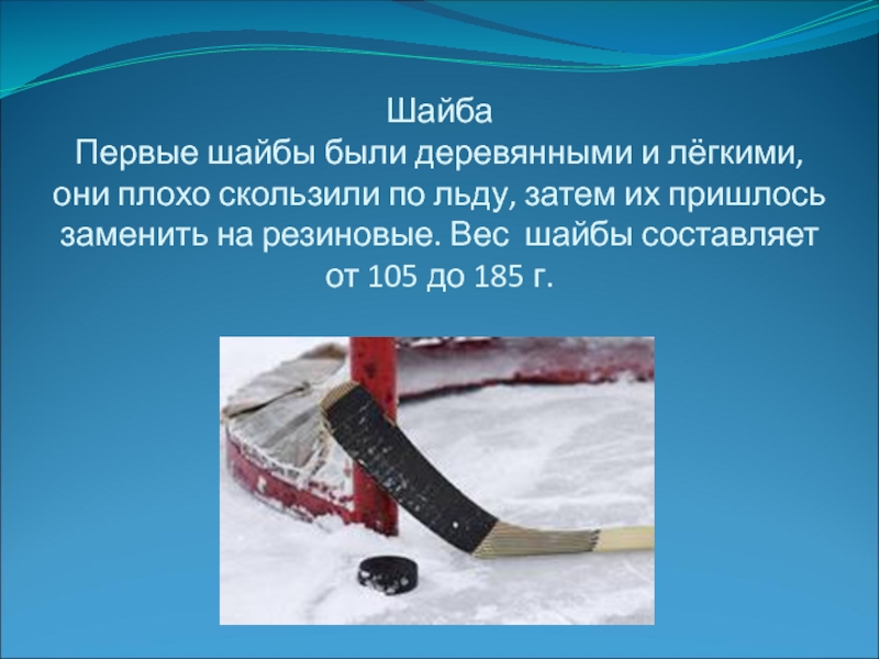 льду, затем их пришлось заменить на резиновые. Вес шайбы составляет