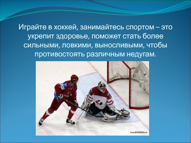 Слайд 17Играйте в хоккей, занимайтесь спортом – это укрепит здоровье, поможет