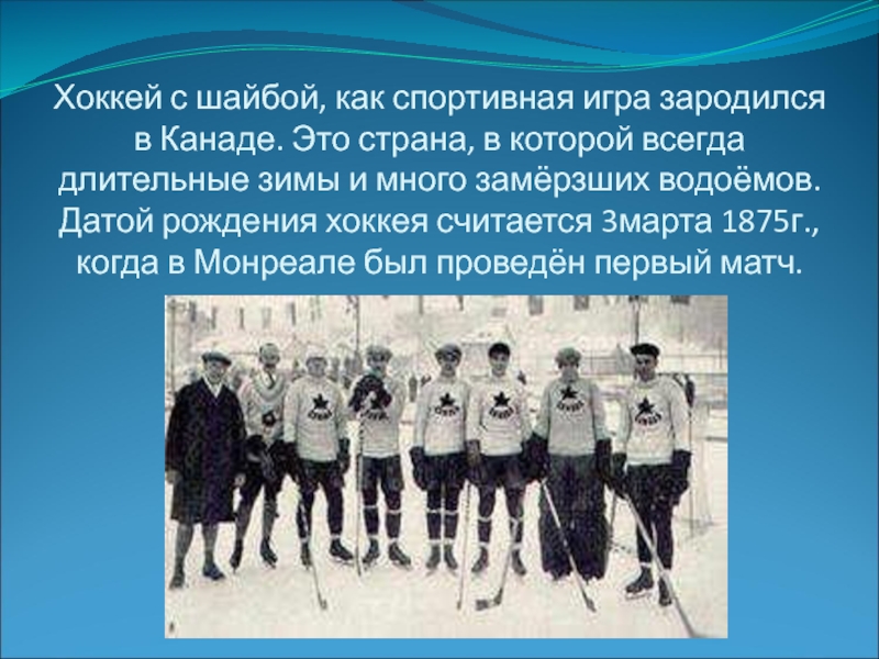 Датой рождения хоккея считается 3марта 1875г., когда в Монреале был проведён первый матч.
