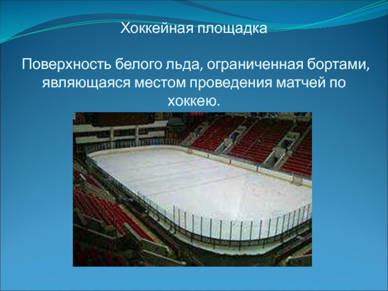 Поверхность белого льда, ограниченная бортами, являющаяся местом проведения матчей