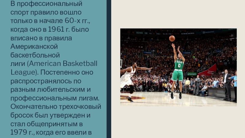 Однако идея долго не приживалась, поэтому дата, когда ввели трехочковый бросок в баскетболе, наступила гораздо позже