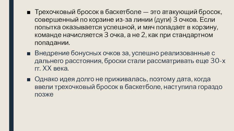 мяч попадает в корзину, команде начисляется 3 очка, а не 2, как при стандартном попадании.Внедрение бонусных очков за, успешно реализованные с дальнего расстояния, броски стали рассматривать еще 30-х гг. XX века.