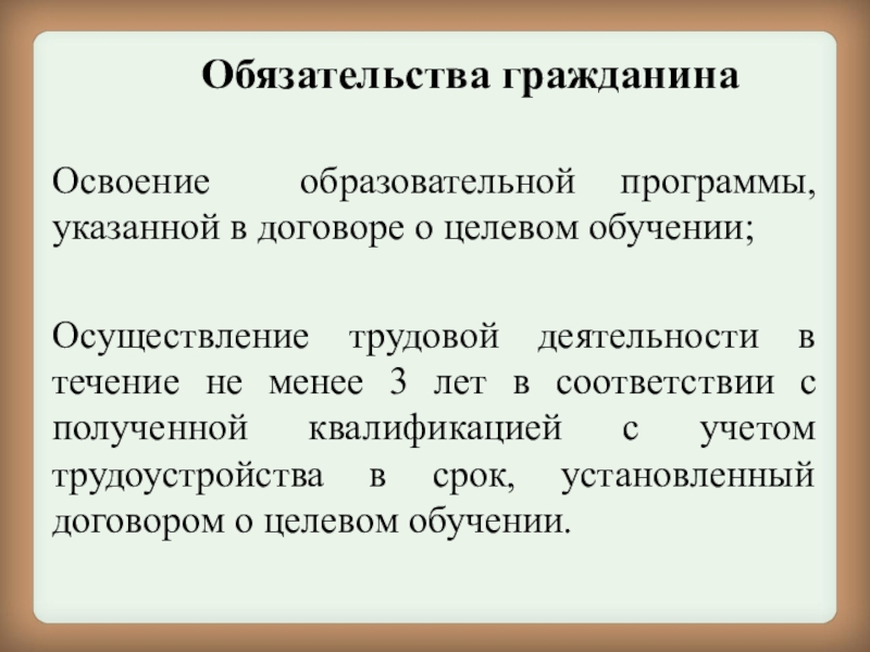 Обязательства гражданинаОсвоение образовательной программы, указанной в договоре о целевом обучении;Осуществление трудовой деятельности в течение не менее 3