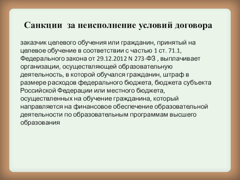 Санкции за неисполнение условий договоразаказчик целевого обучения или гражданин, принятый на целевое обучение в соответствии с частью