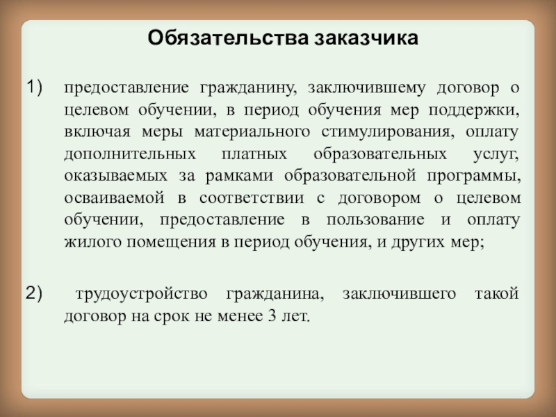 Обязательства заказчикапредоставление гражданину, заключившему договор о целевом обучении, в период обучения мер поддержки, включая меры материального стимулирования,