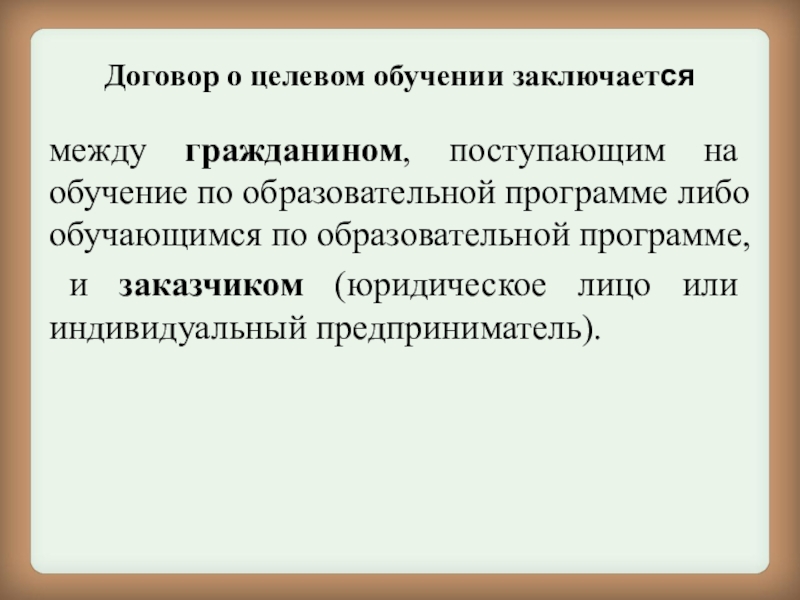 Договор о целевом обучении заключается между гражданином, поступающим на обучение по образовательной программе либо обучающимся по образовательной