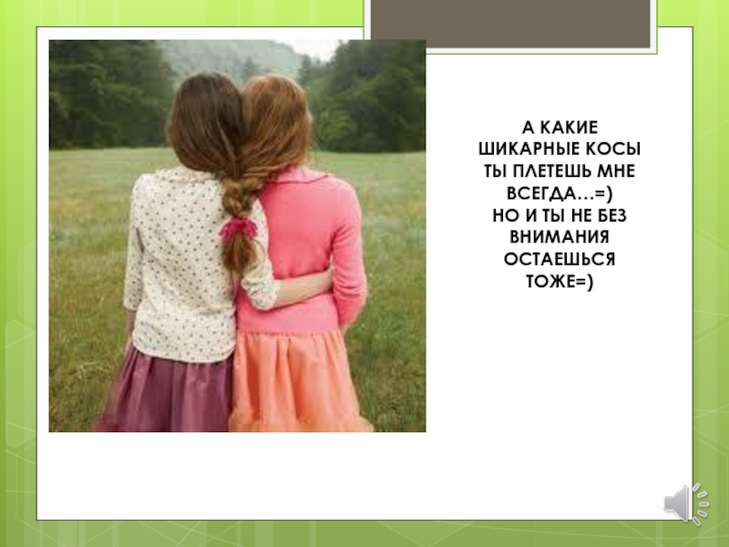 Слайд 9А КАКИЕ ШИКАРНЫЕ КОСЫ ТЫ ПЛЕТЕШЬ МНЕ ВСЕГДА…=) НО И ТЫ