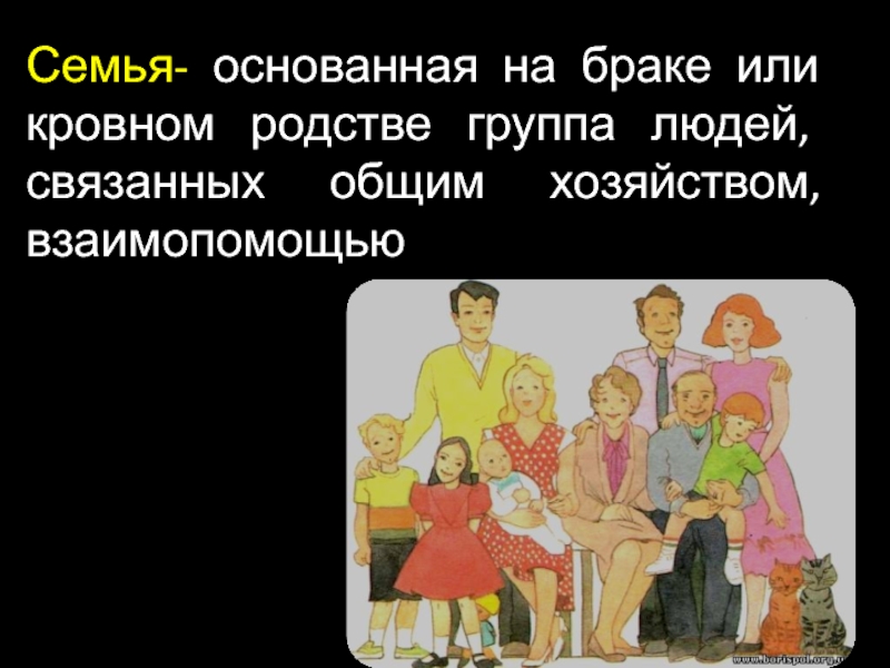 Семья- основанная на браке или кровном родстве группа людей, связанных общим хозяйством, взаимопомощью