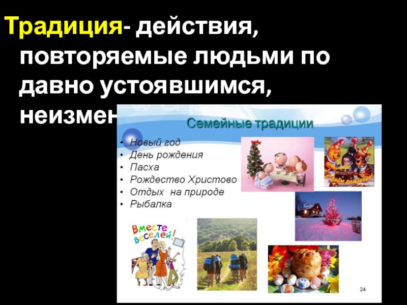 Традиция- действия, повторяемые людьми по давно устоявшимся, неизменным правилам