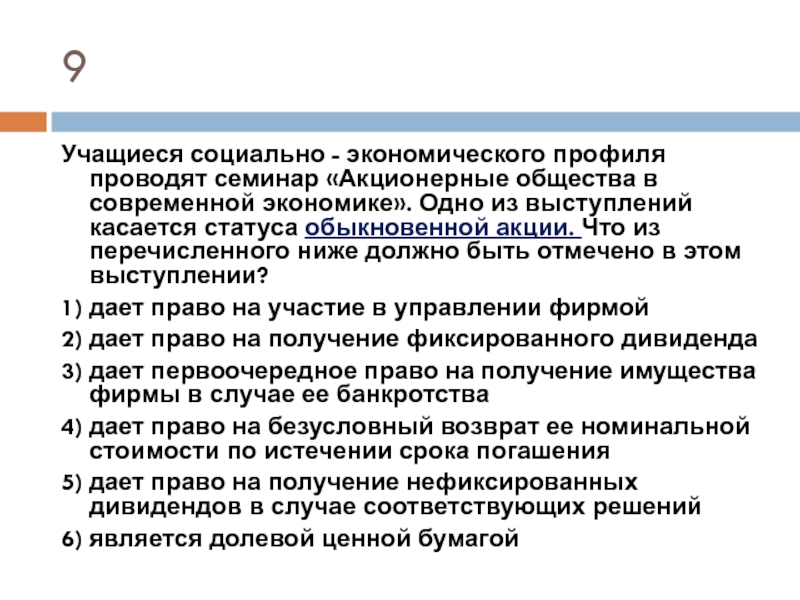 В) держатель этой ценной бумаги имеет право на часть имущества, остающегося после ликвидации предприятия.