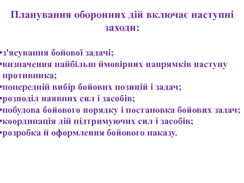 Слайд 15Планування оборонних дій включає наступні заходи: