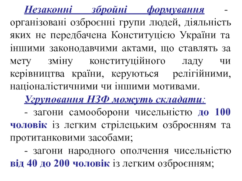 Слайд 20Незаконні збройні формування - організовані озброєнні групи людей, діяльність яких