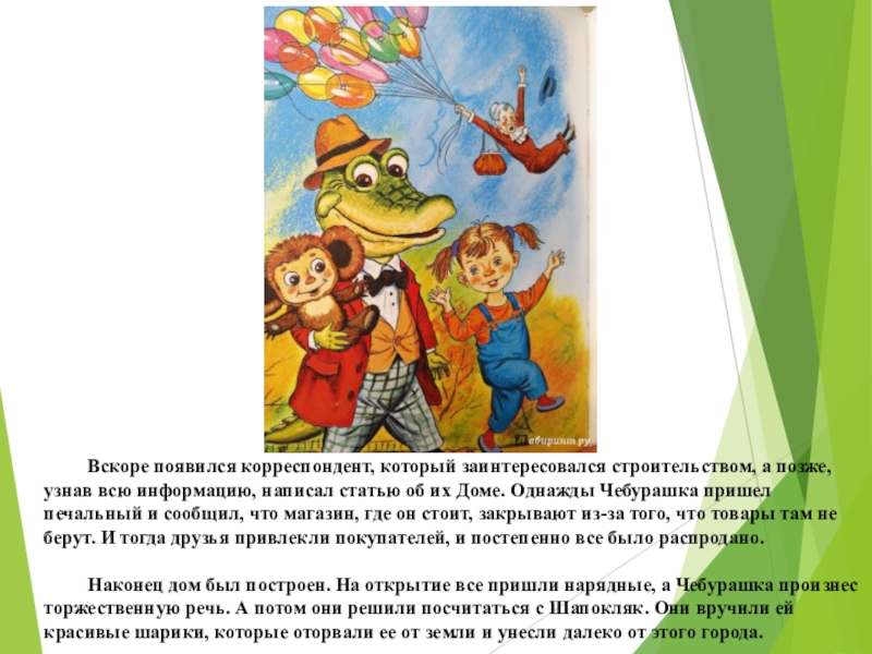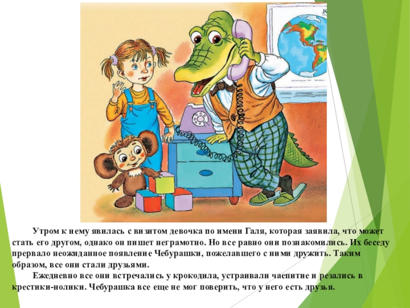 неграмотно. Но все равно они познакомились. Их беседу прервало неожиданное появление Чебурашки, пожелавшего с ними дружить. Таким образом, все они стали друзьями.