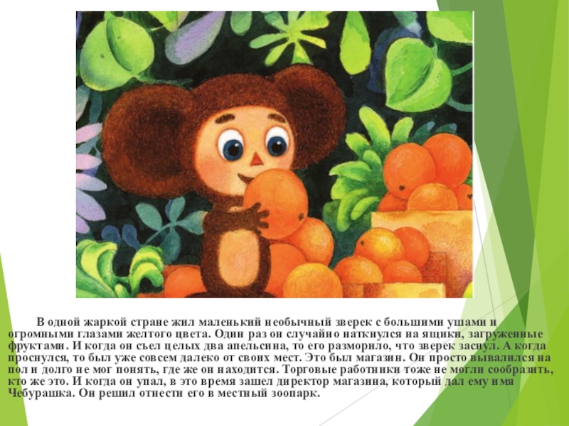 наткнулся на ящики, загруженные фруктами. И когда он съел целых два апельсина, то его разморило, что зверек заснул. А когда проснулся, то был уже совсем далеко от своих мест. Это был магазин. Он просто вывалился на пол и долго не мог понять, где же он находится. Торговые работники тоже не могли сообразить, кто же это. И когда он упал, в это время зашел директор магазина, который дал ему имя Чебурашка. Он решил отнести его в местный зоопарк.