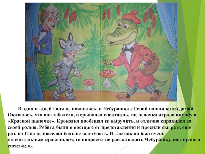 срывался спектакль, где девочка играла внучку в «Красной шапочке». Крокодил пообещал ее выручить, и отлично справился со своей ролью. Ребята были в восторге от представления и просили сыграть еще раз, но Гена не пожелал больше выступать. И так как он был очень стеснительным крокодилом, то попросил не рассказывать Чебурашку, как прошел спектакль.