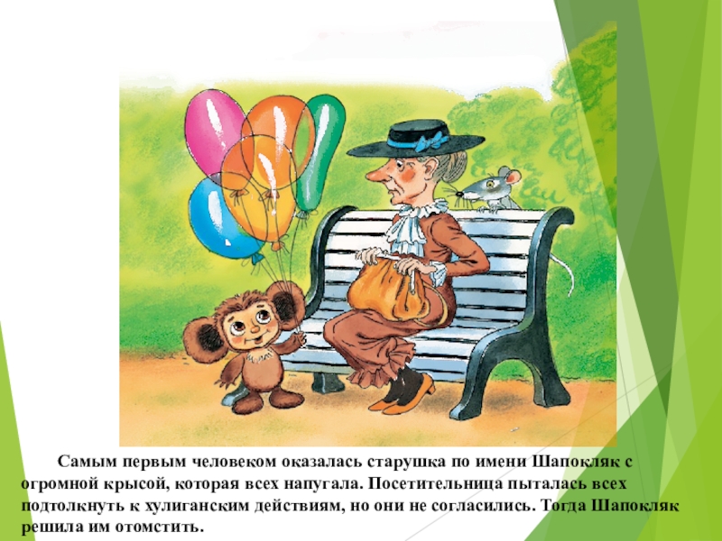 Слайд 8 Самым первым человеком оказалась старушка по имени Шапокляк с огромной