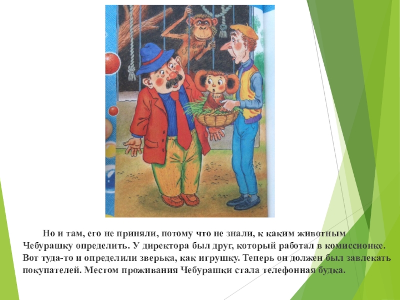 работал в комиссионке. Вот туда-то и определили зверька, как игрушку. Теперь он должен был завлекать покупателей. Местом проживания Чебурашки стала телефонная будка.