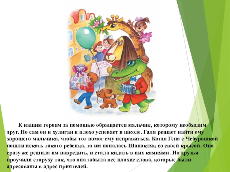 Галя решает найти ему хорошего мальчика, чтобы тот помог ему исправиться. Когда Гена с Чебурашкой пошли искать такого ребенка, то им попалась Шапокляк со своей крысой. Она сразу же решила им навредить, и стала кидать в них камнями. Но друзья проучили старуху так, что она забыла все плохие слова, которые были адресованы в адрес приятелей.