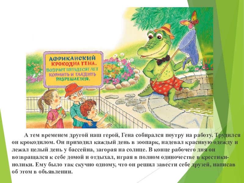 работу. Трудился он крокодилом. Он приходил каждый день в зоопарк,