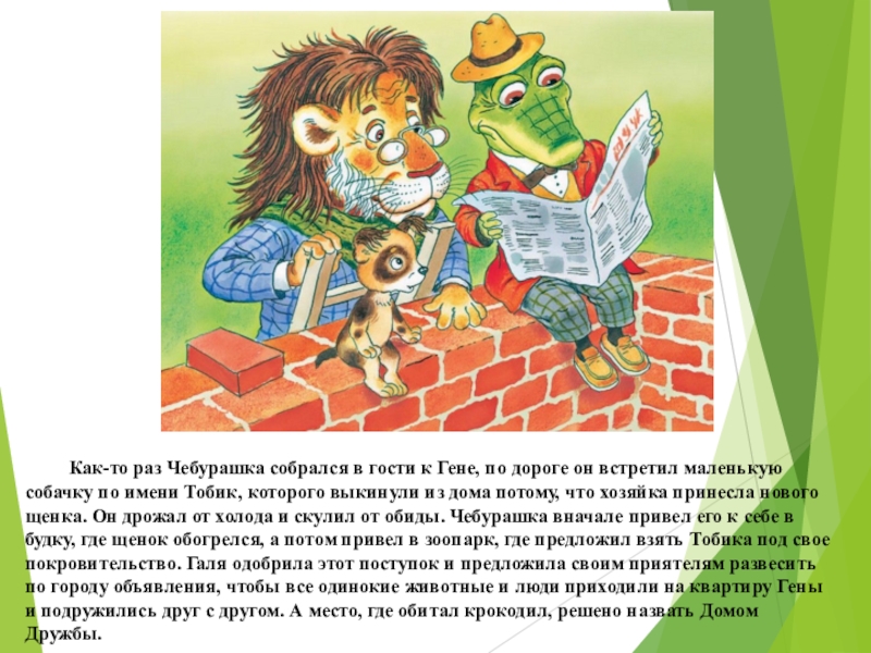 дома потому, что хозяйка принесла нового щенка. Он дрожал от холода и скулил от обиды. Чебурашка вначале привел его к себе в будку, где щенок обогрелся, а потом привел в зоопарк, где предложил взять Тобика под свое покровительство. Галя одобрила этот поступок и предложила своим приятелям развесить по городу объявления, чтобы все одинокие животные и люди приходили на квартиру Гены и подружились друг с другом. А место, где обитал крокодил, решено назвать Домом Дружбы.