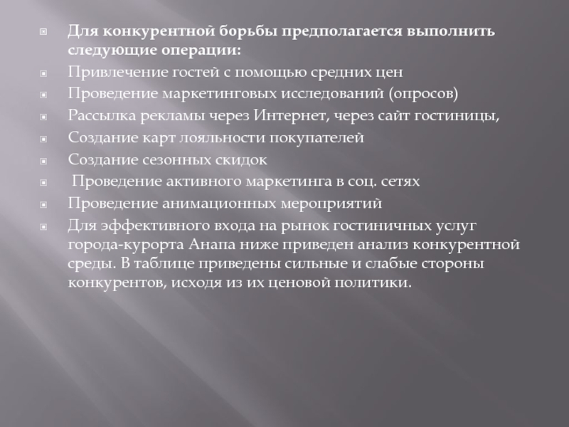 Слайд 25Для конкурентной борьбы предполагается выполнить следующие операции: