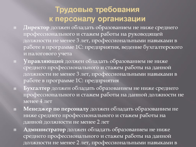 К трудовым ресурсам применяются следующие требования: образование не ниже среднего, стаж работы от 2 лет.