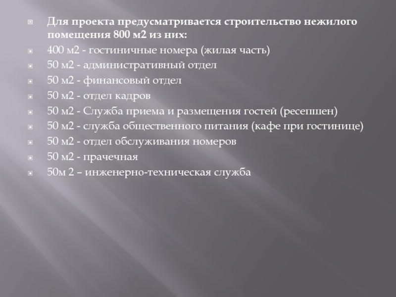 Слайд 38Для проекта предусматривается строительство нежилого помещения 800 м2 из них: