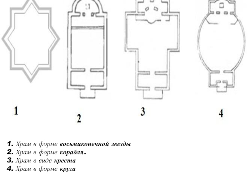 1. Храм в форме восьмиконечной звезды 2. Храм в форме корабля. 3. Храм в виде креста4. Храм в форме круга