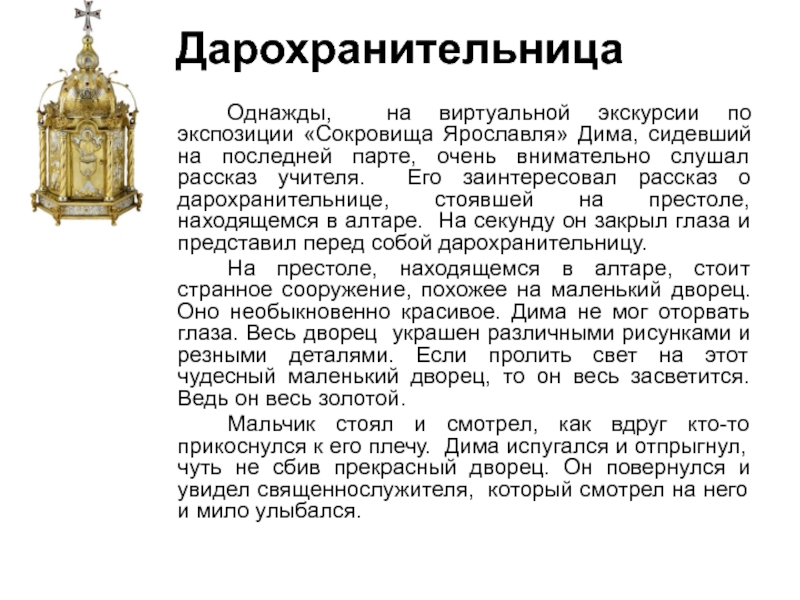 Дарохранительница 				Однажды, на виртуальной экскурсии по экспозиции «Сокровища Ярославля» Дима, сидевший на последней парте, очень внимательно слушал