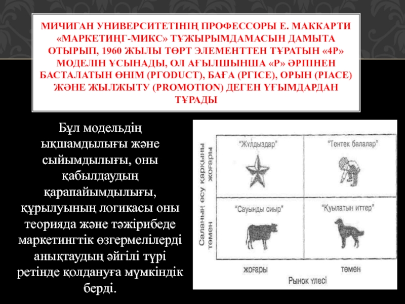 Мичиган университетінің профессоры Е. Маккарти «маркетиңг-микс» тұжырымдамасын дамыта отырып, 1960 жылы төрт элементтен тұратын «4Р» моделін ұсынады, ол ағылшынша «р» әрпінен басталатын өнім (ргоduct), баға (ргісе), орын (рiасе) және жылжыту (рrоmоtiоn) деген үғымдардан тұрады