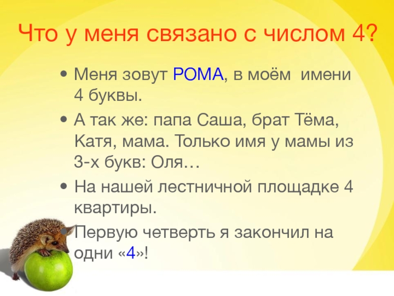 Слайд 4Что у меня связано с числом 4?