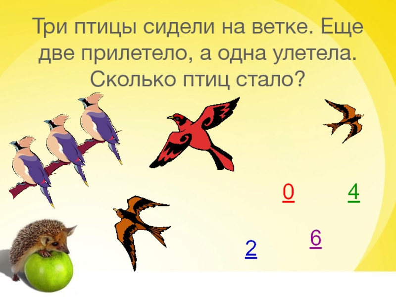Слайд 26Три птицы сидели на ветке. Еще две прилетело, а одна