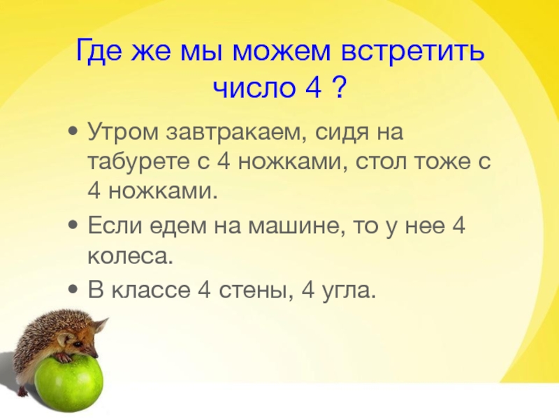 Слайд 5Где же мы можем встретить число 4 ?