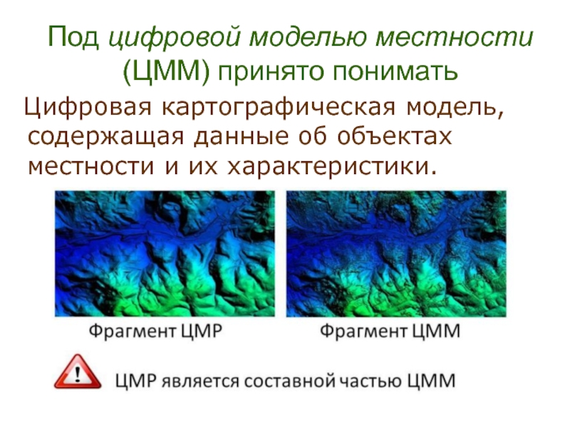 Слайд 23Под цифровой моделью местности (ЦММ) принято понимать