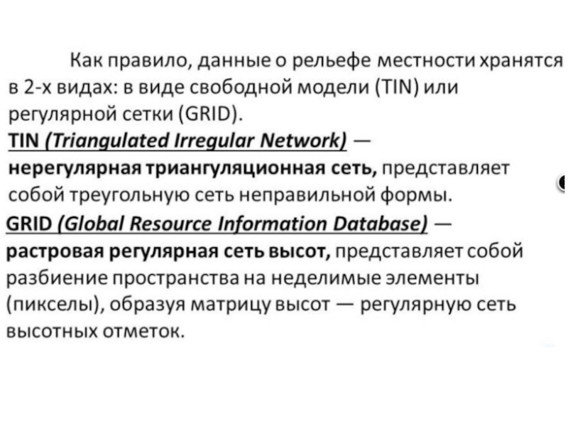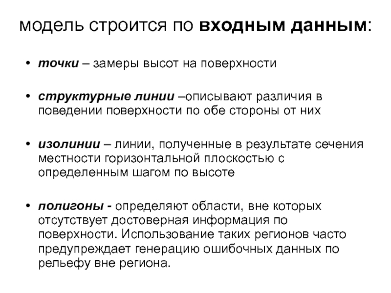 Модель рельефа должна с определенной точностью отражать эти элементы, отношения и свойства.