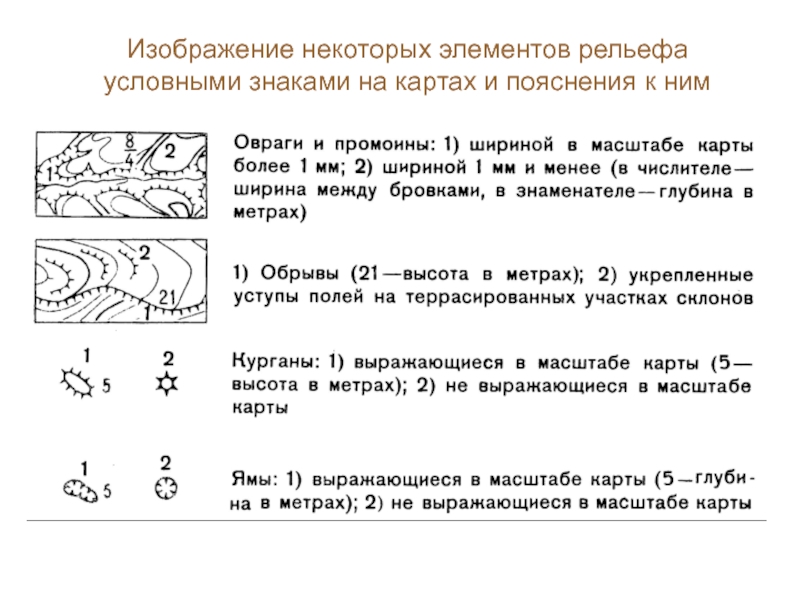 Слайд 18Изображение некоторых элементов рельефа условными знаками на картах и пояснения